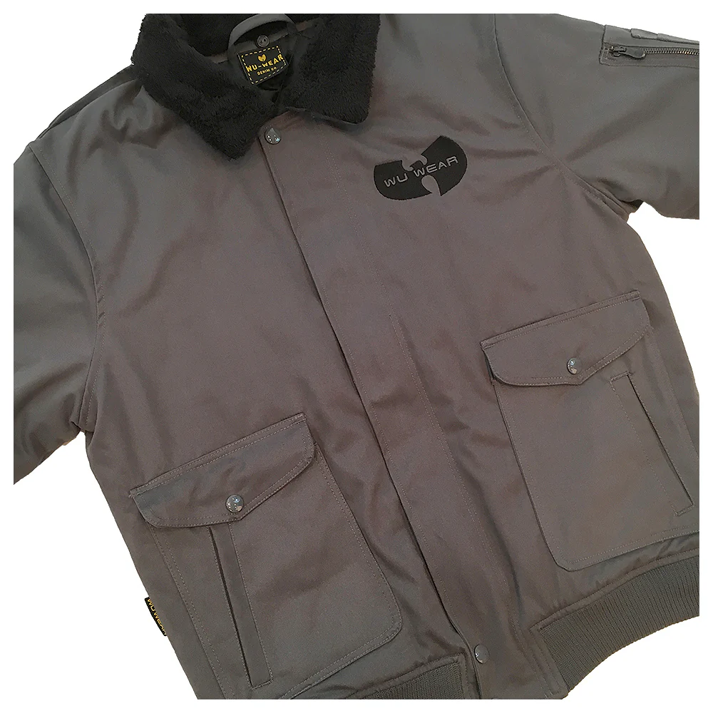 Wu Wear Winter Jacket in grau aus Wollmischung, mit fettem Wu-Tang Sticklogo vorn, flauschiger Fellkragen, Reißverschlusstasche am Ärmel, Seitentaschen, gerippte Abschlüsse an Ärmeln und Saum, gestepptes Futter mit Innentasche – Reißverschluss und abnehmbarer Borg-Kragen,
