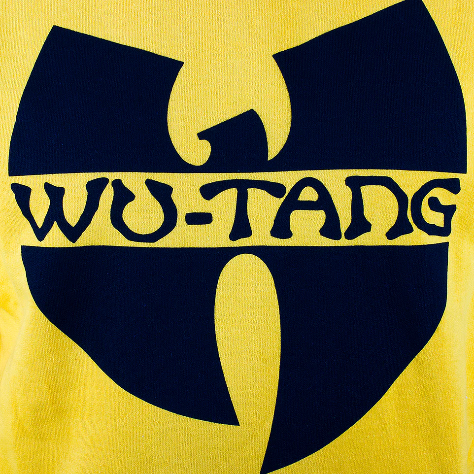 Basic Hooded Kapuzenpullover in gelb mit Wu-Tang Logo Print in schwarz.